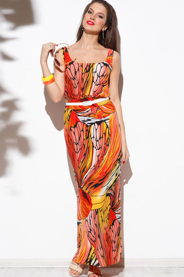 Длинное летнее платье яркой оранжевой расцветки с абстрактным рисунком. Данную модель легко можно дополнить ремешком или другими аксессуарами в зависимости от настроения. Модель чуть приталенного кроя, топ выполнен в виде майки. Ремень не продается!